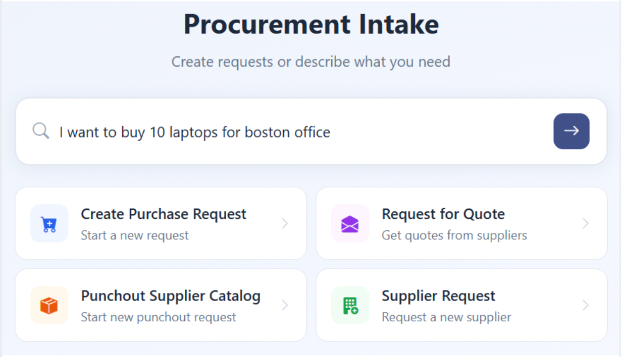 Instead of requiring business users to understand procurement procedures, the system interprets the request and applies the appropriate policies and actions automatically.