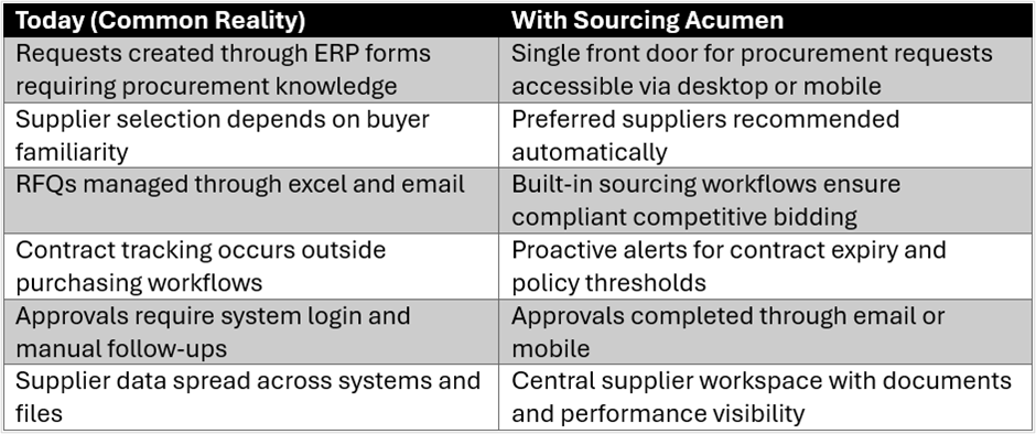 In many organizations, procurement operations rely heavily on ERP-based purchasing workflows (such as Dynamics 365, Oracle, Epicor, or SAP). These systems effectively control transactional processes such as purchase orders, approvals, and financial records. However, ERP requisition processes typically rely on business users to select suppliers, define scope, and determine purchasing paths – often without visibility into preferred suppliers, negotiated contracts, or sourcing strategies.