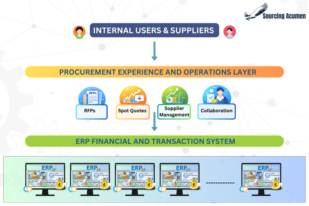 This architecture allows organizations to combine the financial governance of ERP systems with the strategic decision-making capabilities of modern procurement platforms.