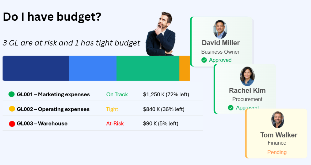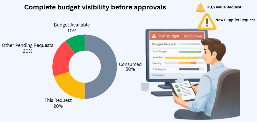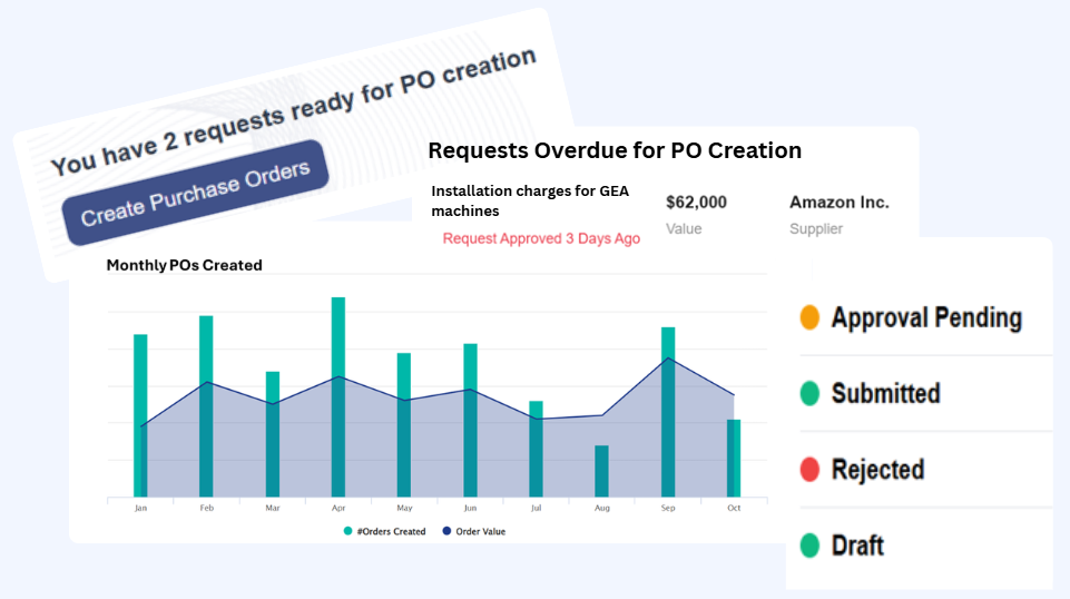 Requests, approvals, sourcing, and POs flow in one system without re-entering data. Faster approvals over emails with detailed context available to approver