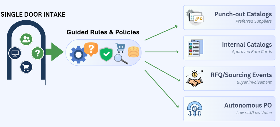 From intake to execution, our platform guides every request through the right sourcing and buying path – automatically enforcing policy, routing approvals, and applying controls