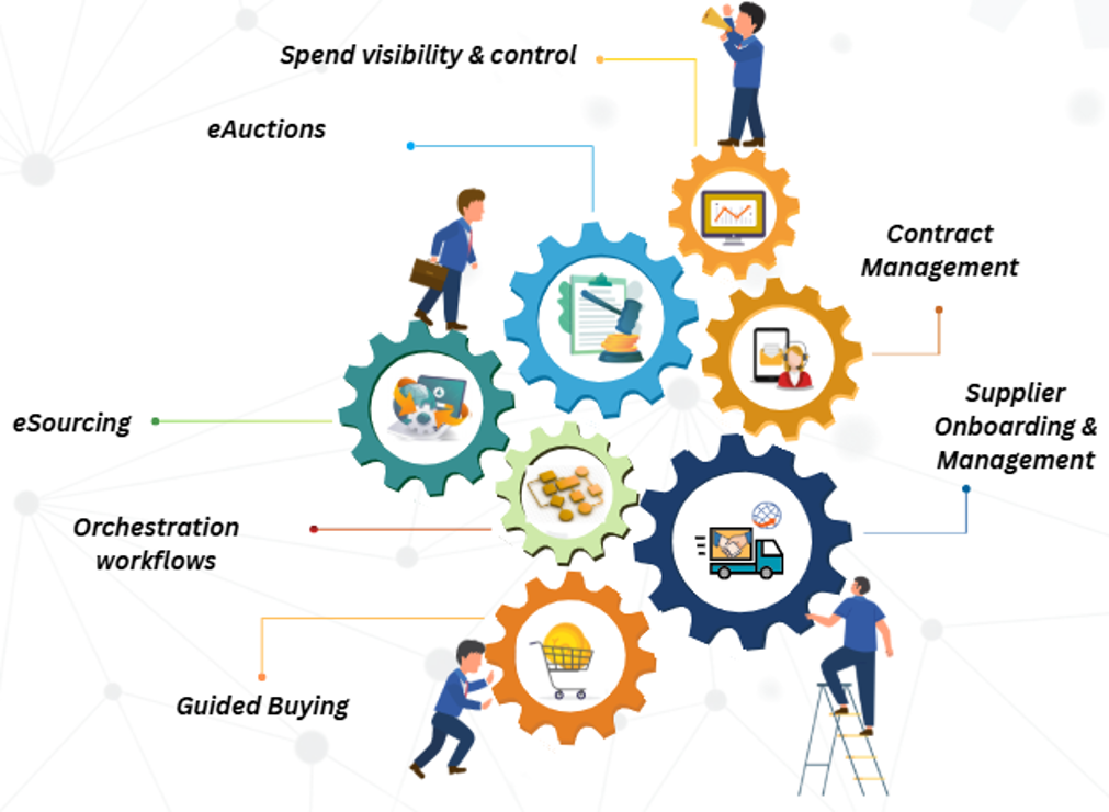 Strategic sourcing & eAuctions | Supplier Onboarding & Management | Contract Management | Guided buying & Orchestration workflows | Spend visibility & execution control